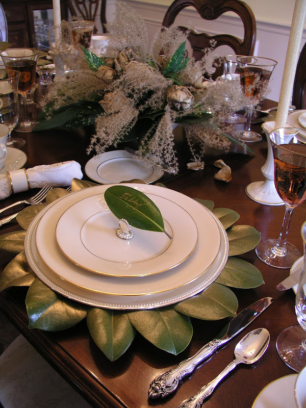 This tableware is simple yet very elegant. It is decorated with fresh Southern Magnolia leaves coated with some gold paint and the single leaf on a place card holder is so alluring in it!