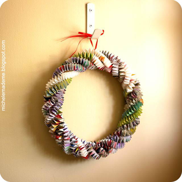 This is an amazing paper wreath to start of my list with. Just fold pages from an old book or magazine into such cone shapes and stick them together. The older the book, the yellower the pages which would give a natural yellow tinge to your wreath! Extremely easy and beautiful!