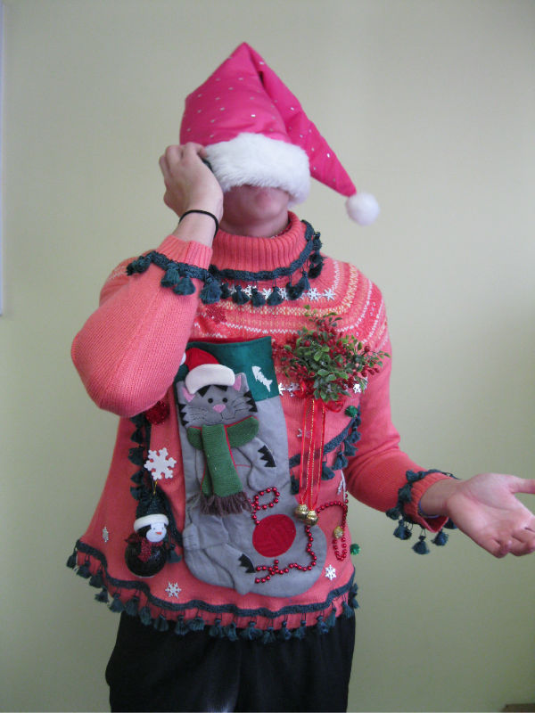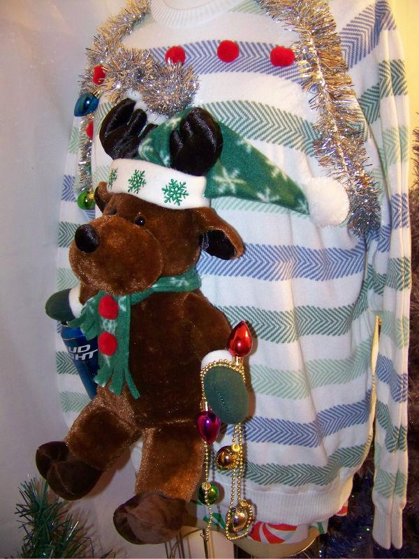 Can it get tackier than this? The candy cane embellishments and ornaments hanging from this sleeveless sweater make it perfectly suitable for its place here.
